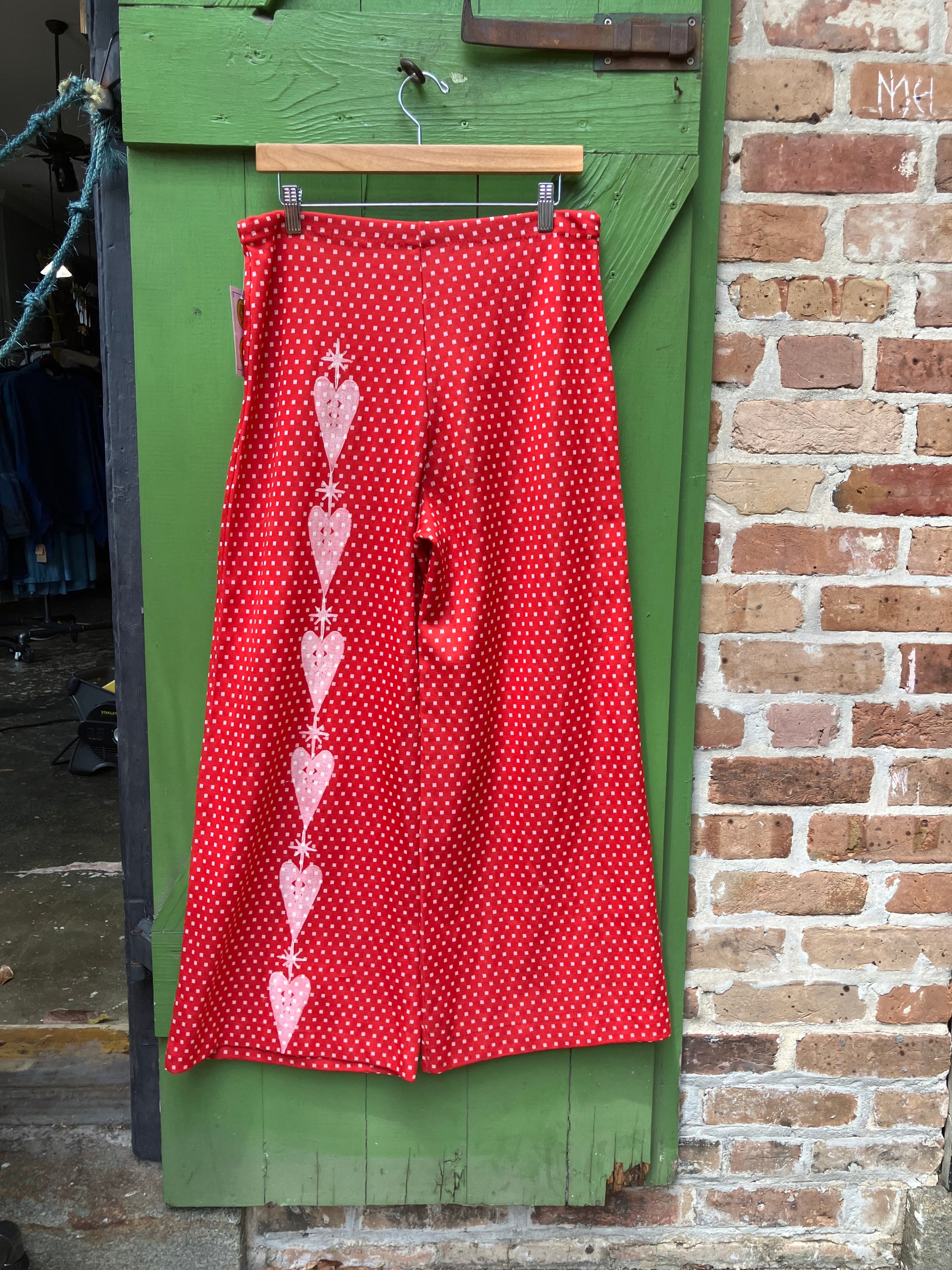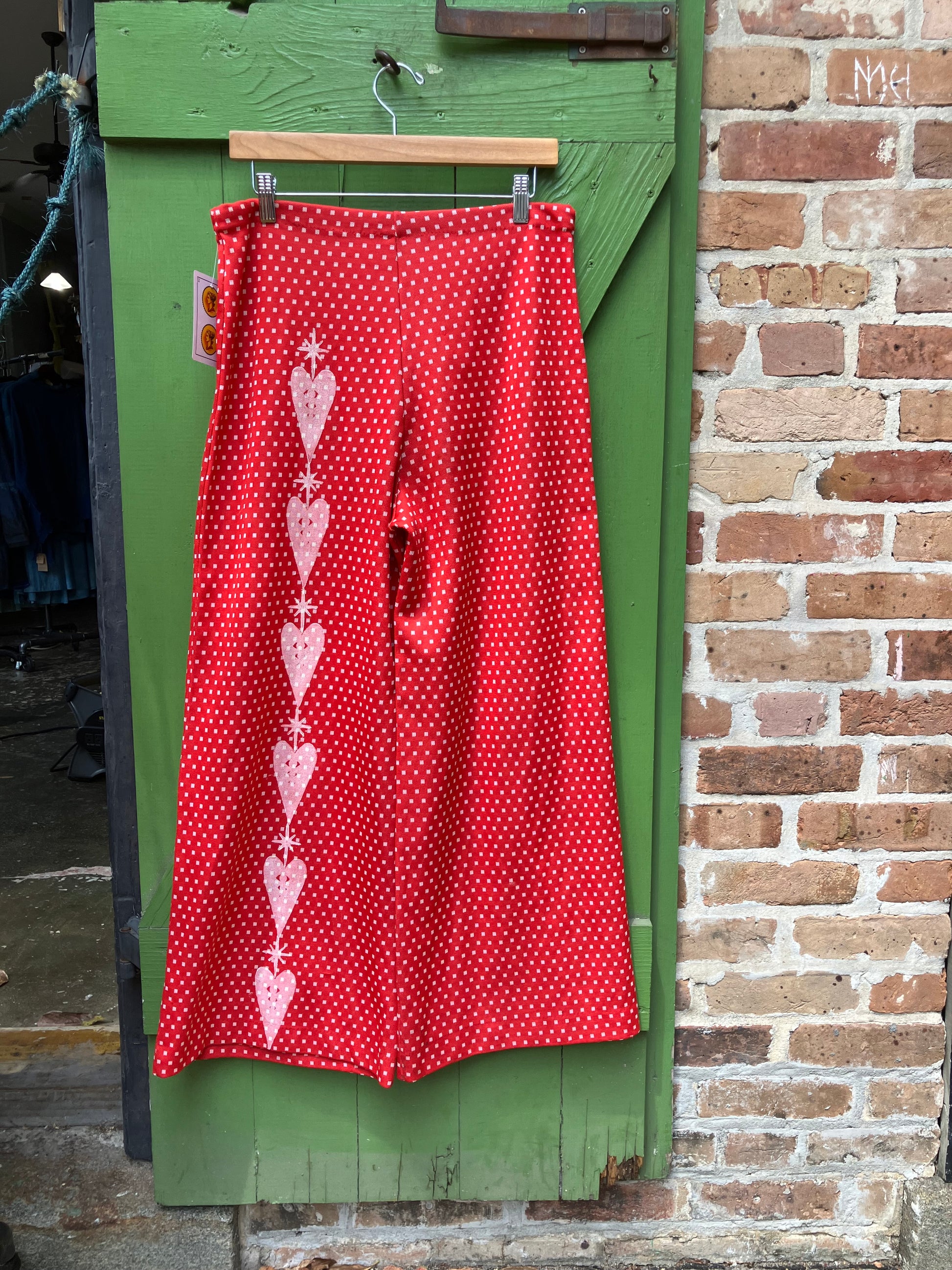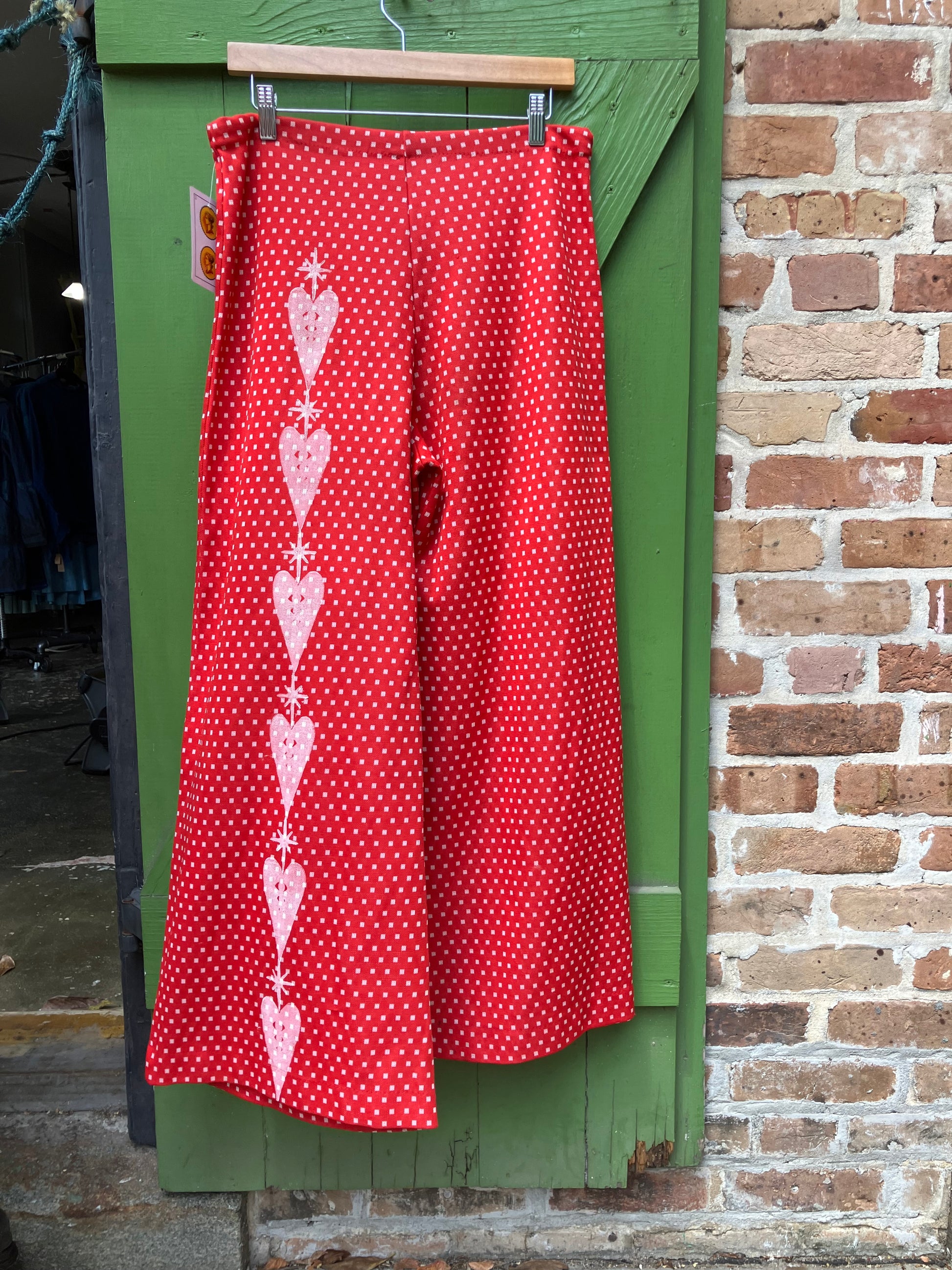Vintage, printed with hand carved Lino block prints, adorned with hearts eyes, the protectors ! “Only the eyes of love can see me now” wearable spell, opposite leg is printed on the back, measurements: waist 32”, hips 40”