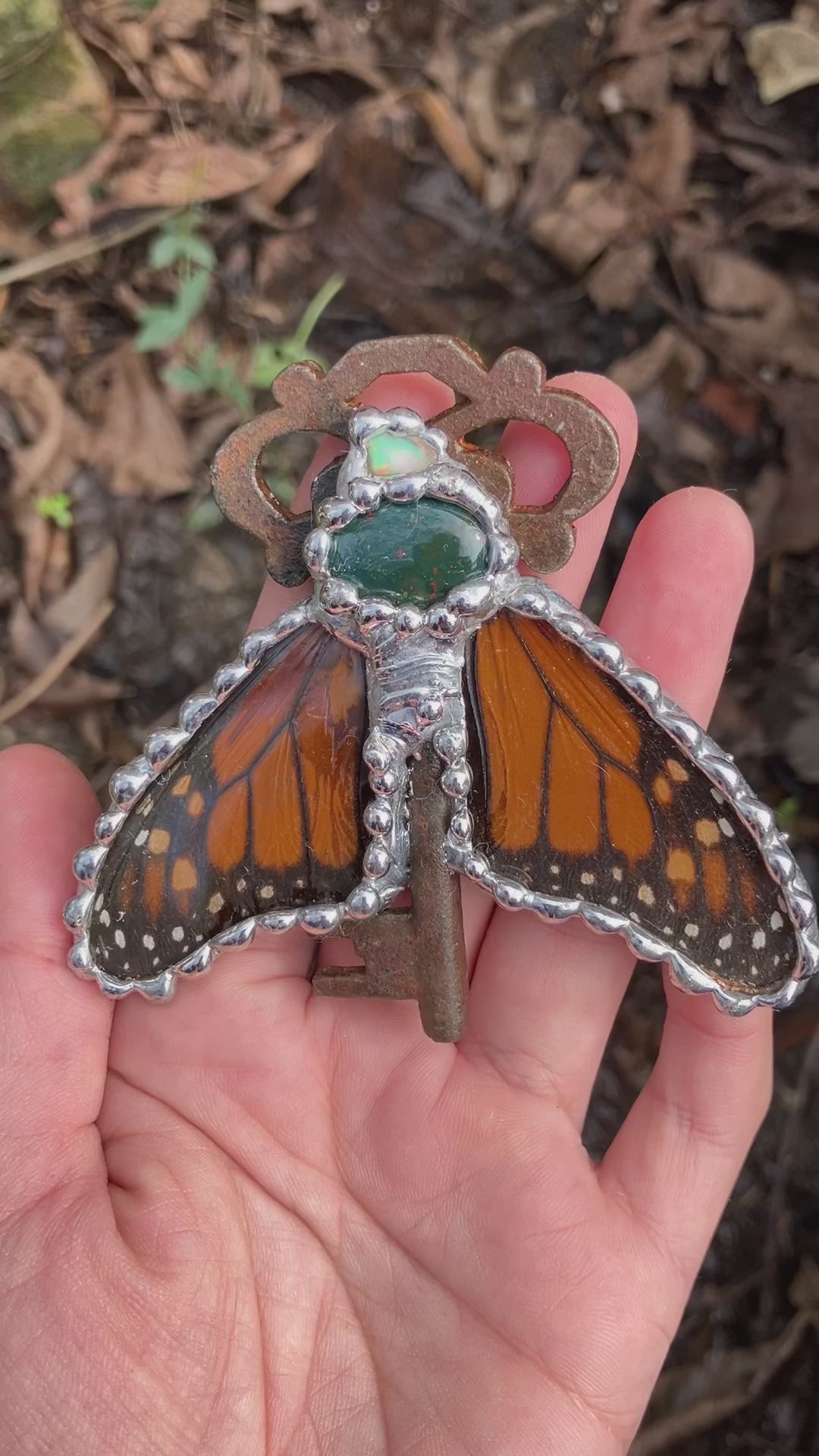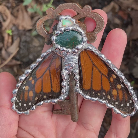 Antique key, raw opal & bloodstone with mon arch in hand cut glass!